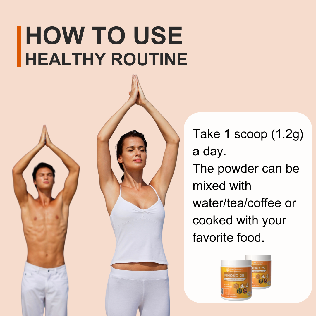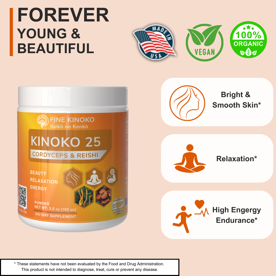 KINOKO 25 is a perfect dual mushroom that supports immunity, natural energy, and youthfulness. Our Mushrooms are organically grown and manufactured in the USA and Japan. Unlock your full potential with the help of Fine Kinoko today!*